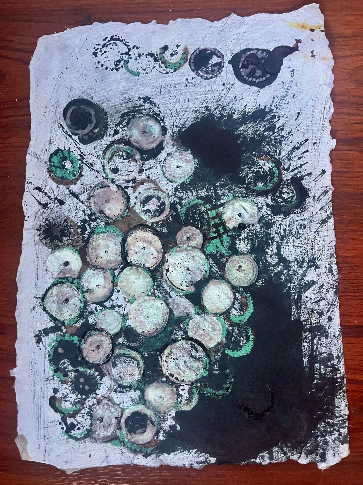 ivory black ink, cream turquoise eye shadow, gold sharpie and white paint on parchment. mounted on psychadelic cat magazine.