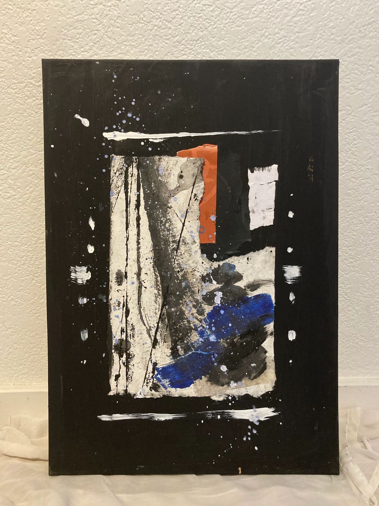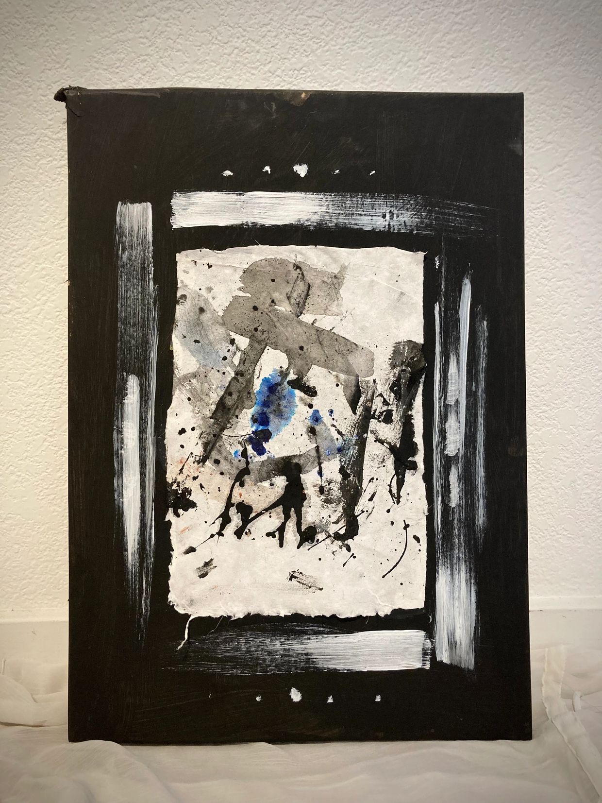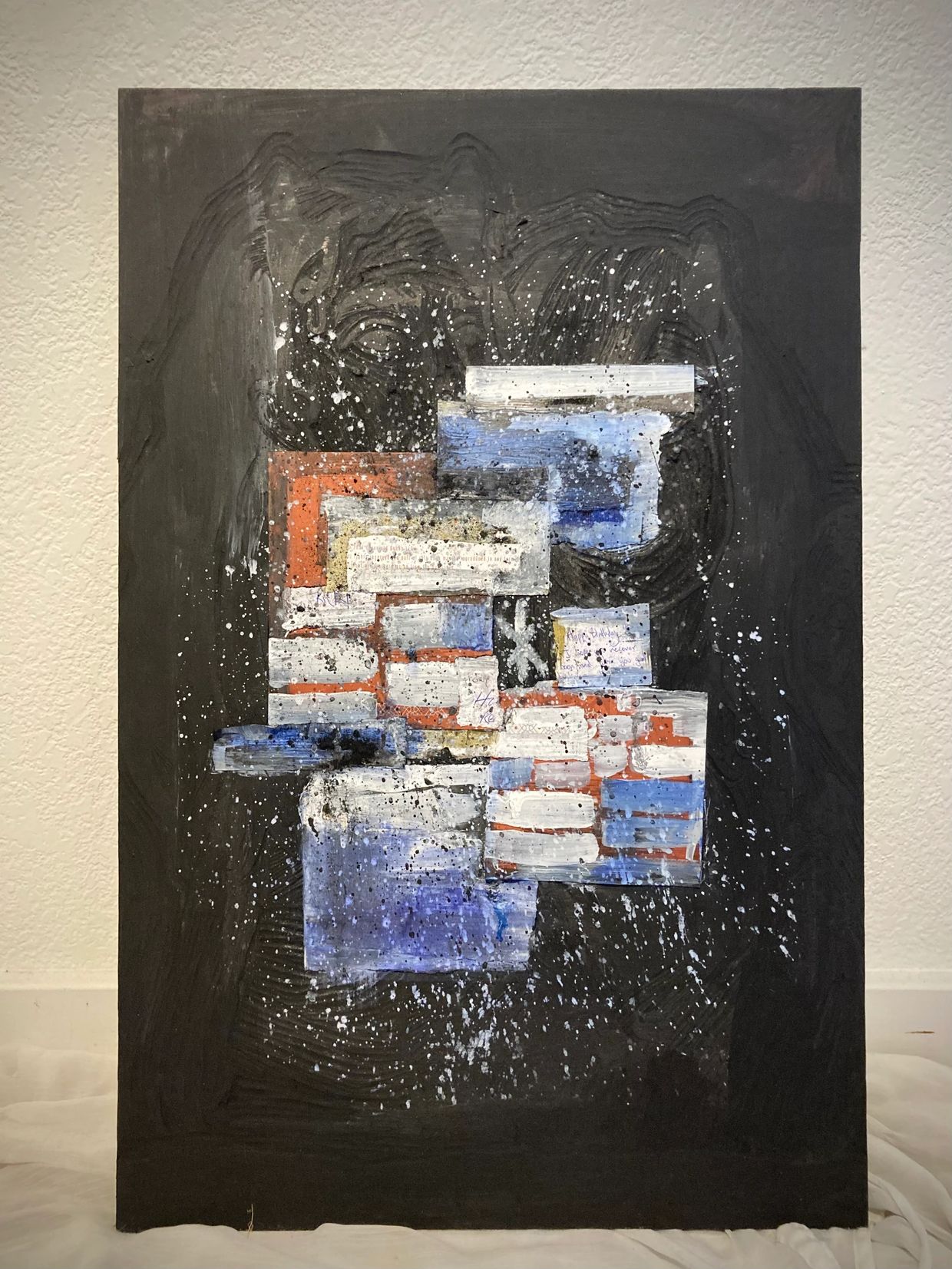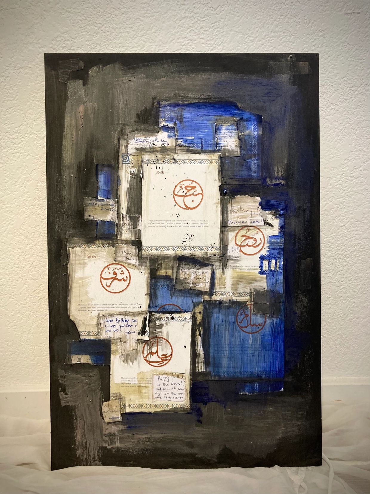 ibuprofen dust, ebony ink, blue ink, torn up birthday card, unnamed arabic quote book and acrylic paint on found print board