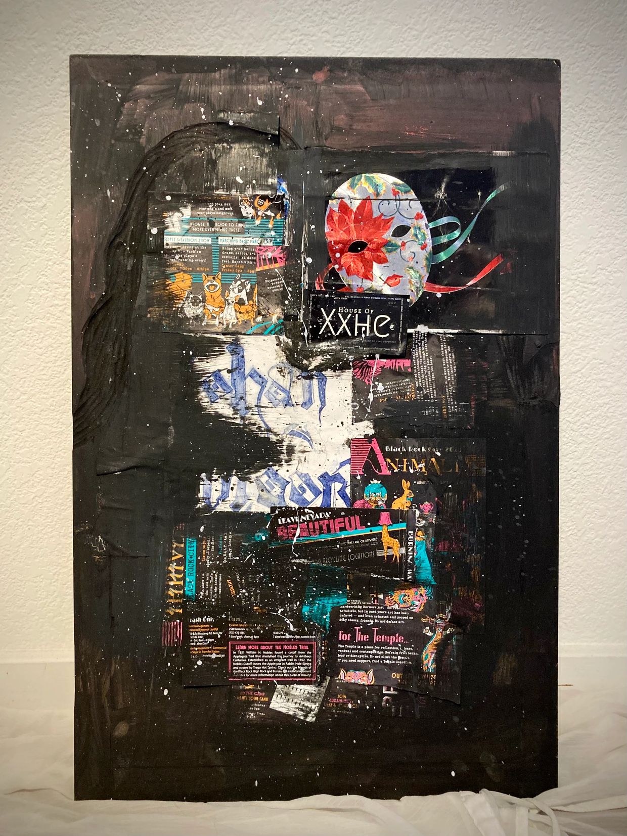 Xxhe stickers, dilapidated Burning Man 2023 Animalia booklet, birthday card from the sidewalk, ebony ink, Johan Invigora’s nametag from the convent art house, wood glue and acrylic paint on found print board