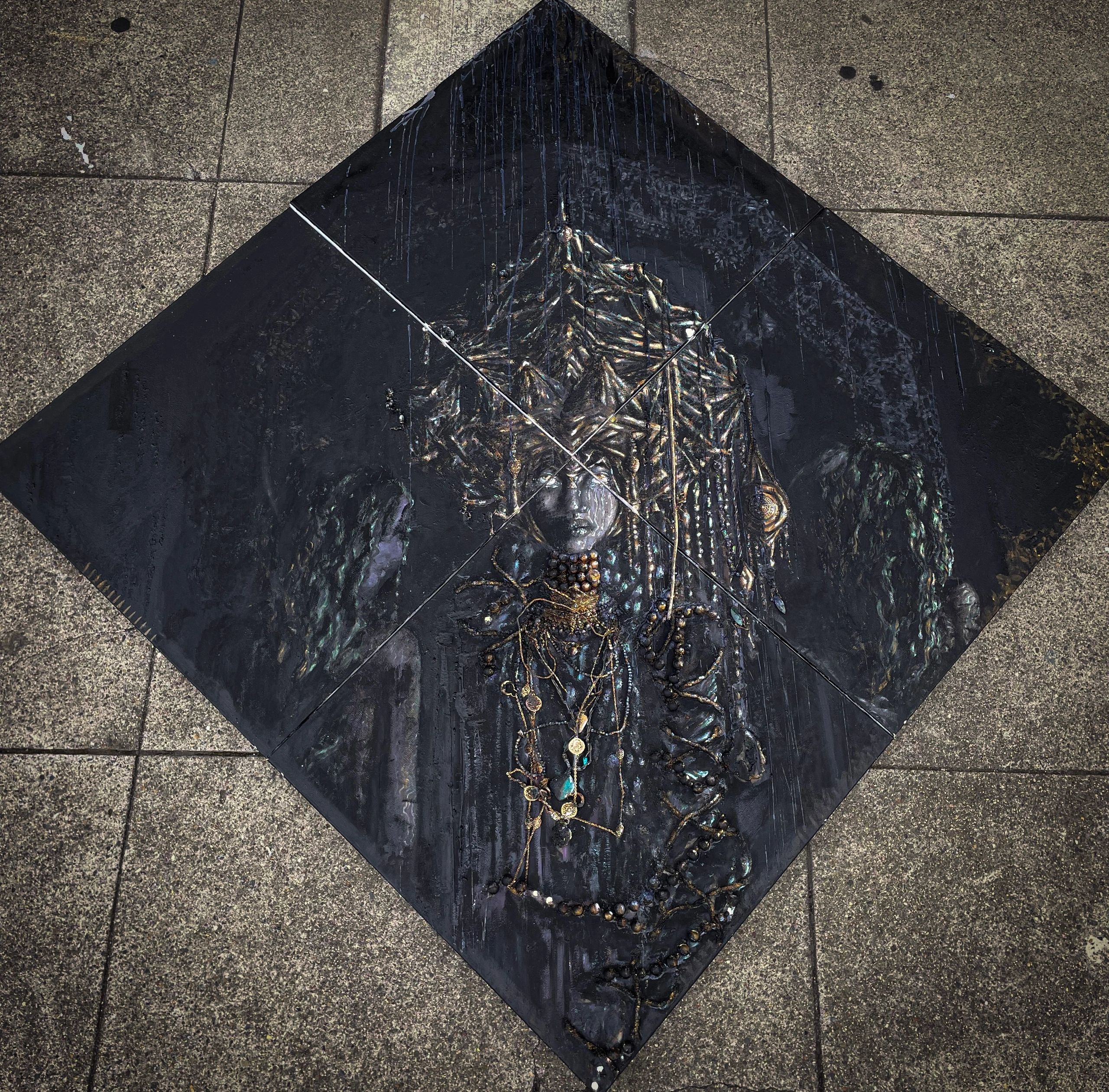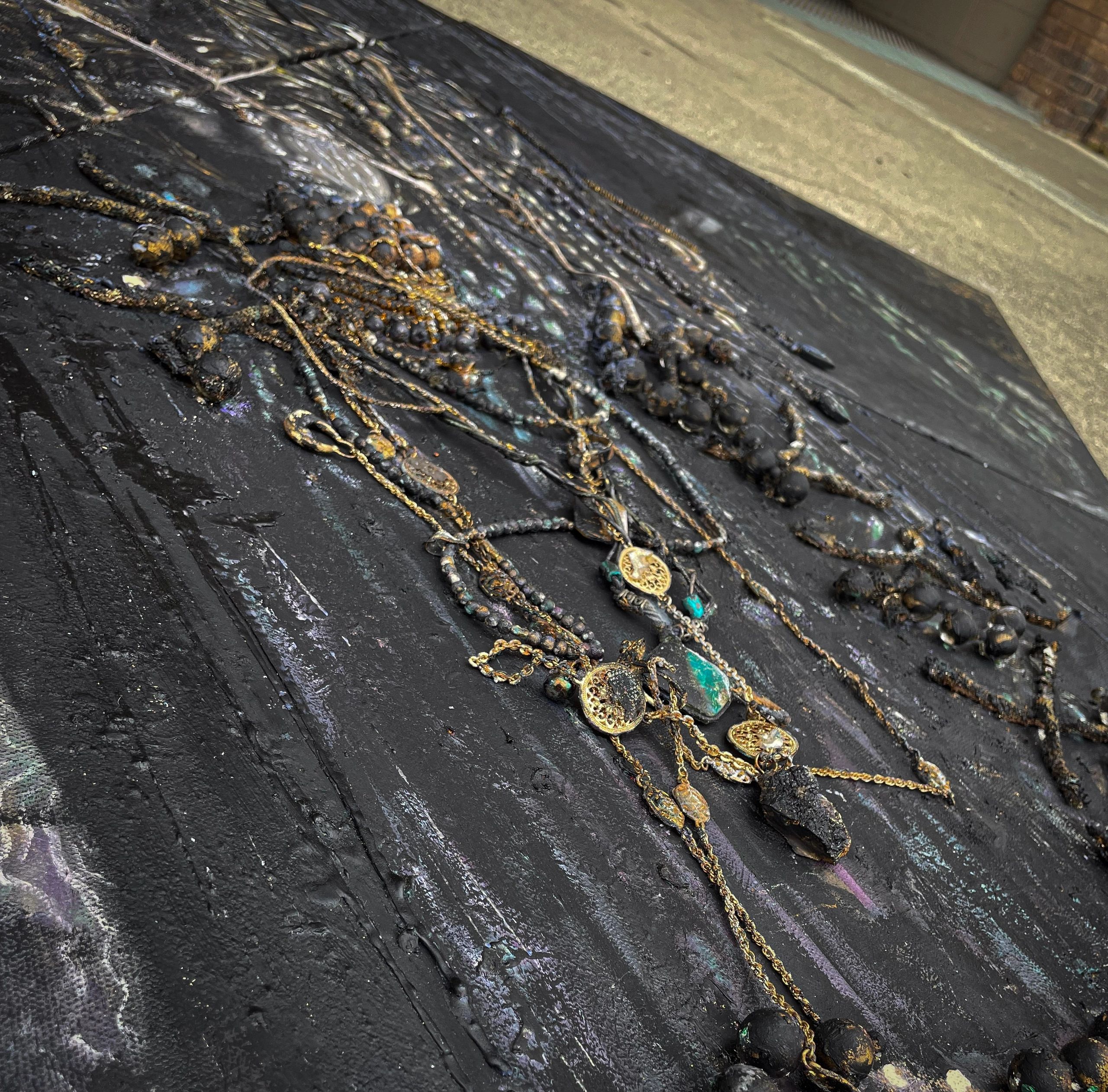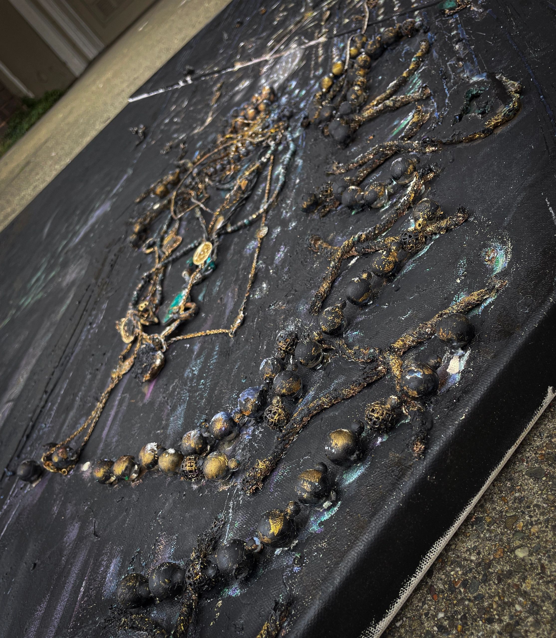 Crafted using a collection of jewelry, glass beads, pearls, wax, ribbons, lace, acrylic paint, oil paint and olive oil.