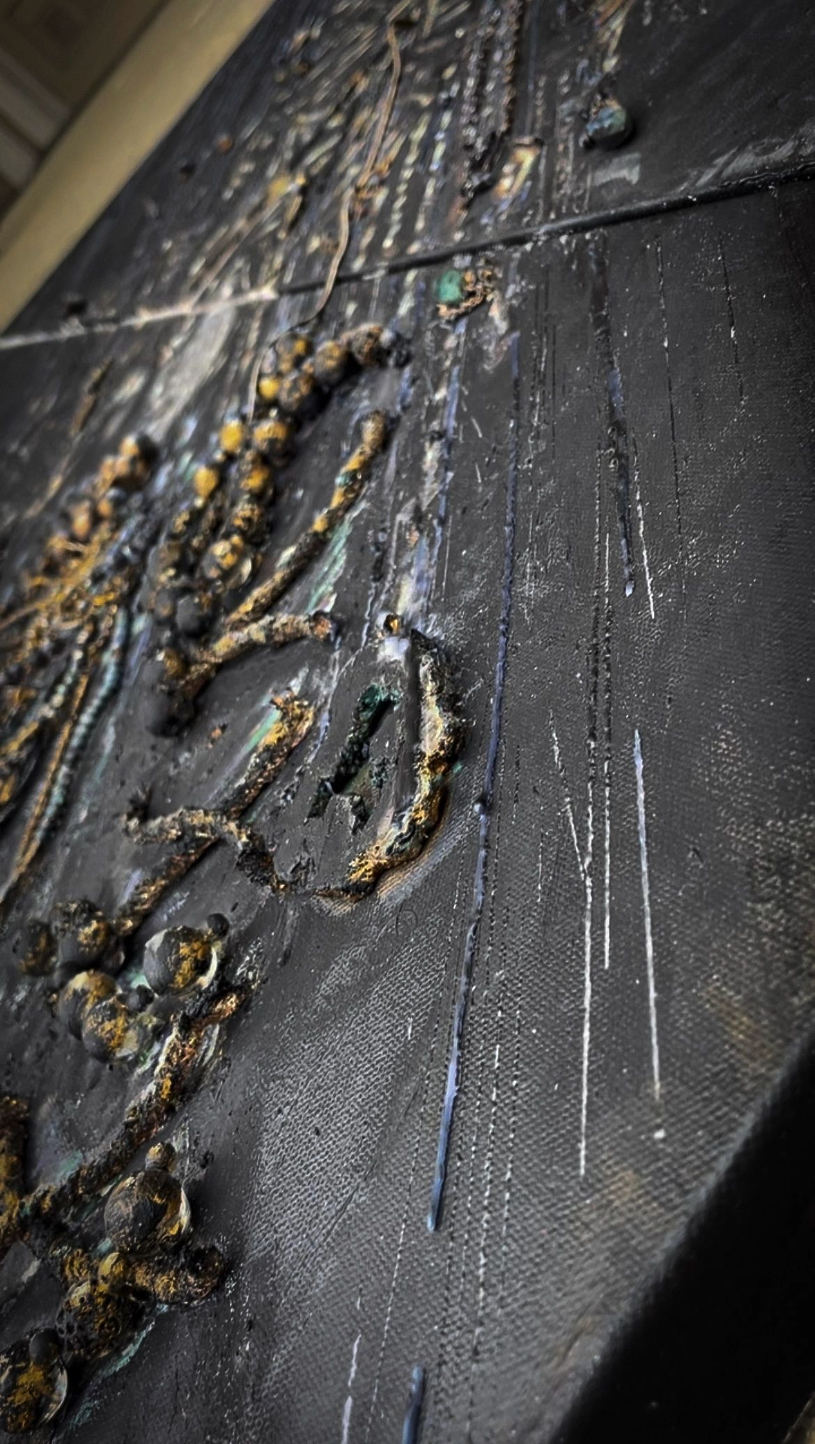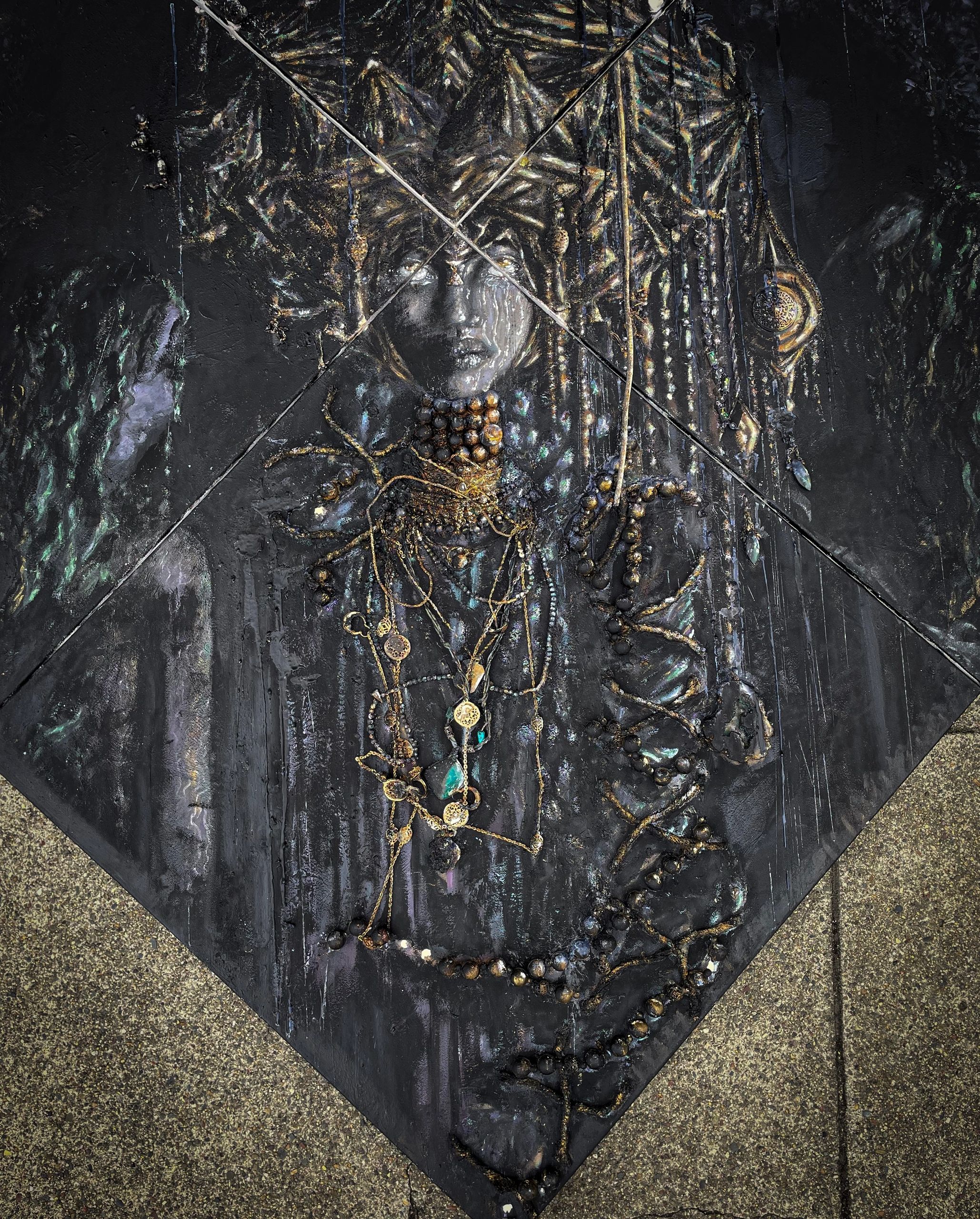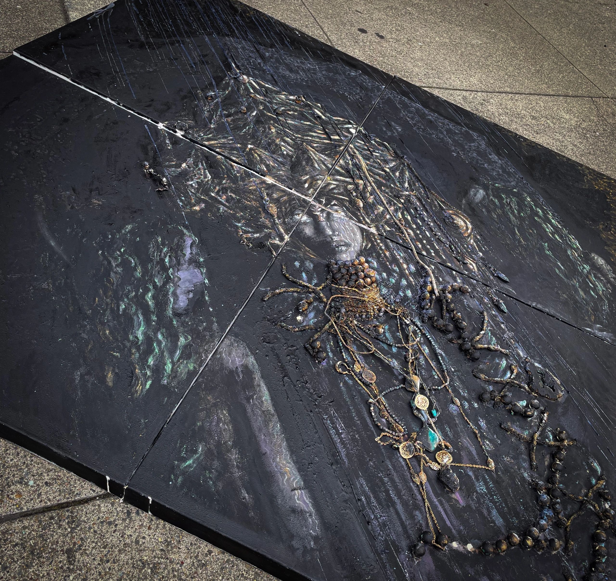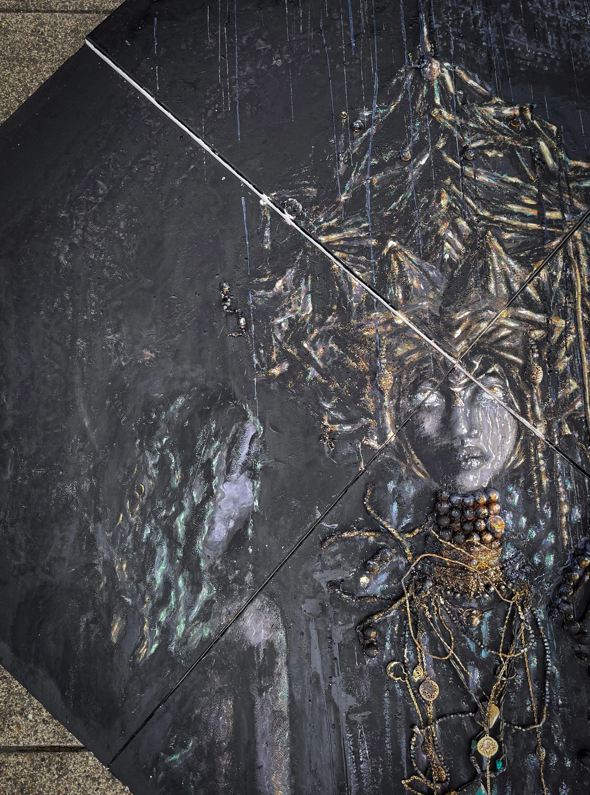 Crafted using a collection of jewelry, glass beads, pearls, wax, ribbons, lace, acrylic paint, oil paint and olive oil.