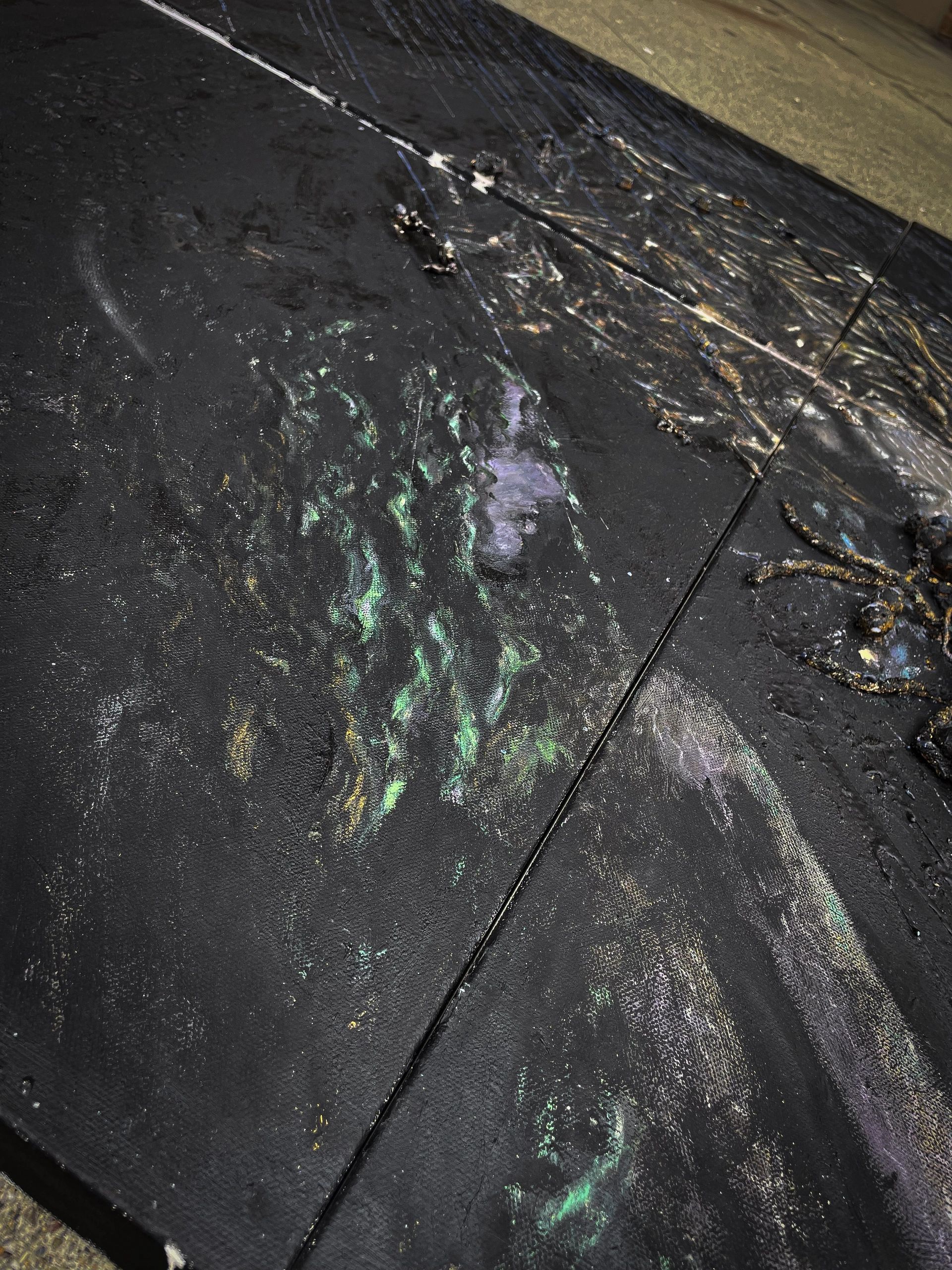 I don’t think Xxhe knew this when they asked me to write a little piece about this painting. Honestly, this is the first time I’m looking at the painting since the night in the gallery. Thankfully now as I look at it, it looks more like a painting. But it does have the lingering aura of a spirit that makes my belly tingle when I think about how close I came to being commanded by its power.